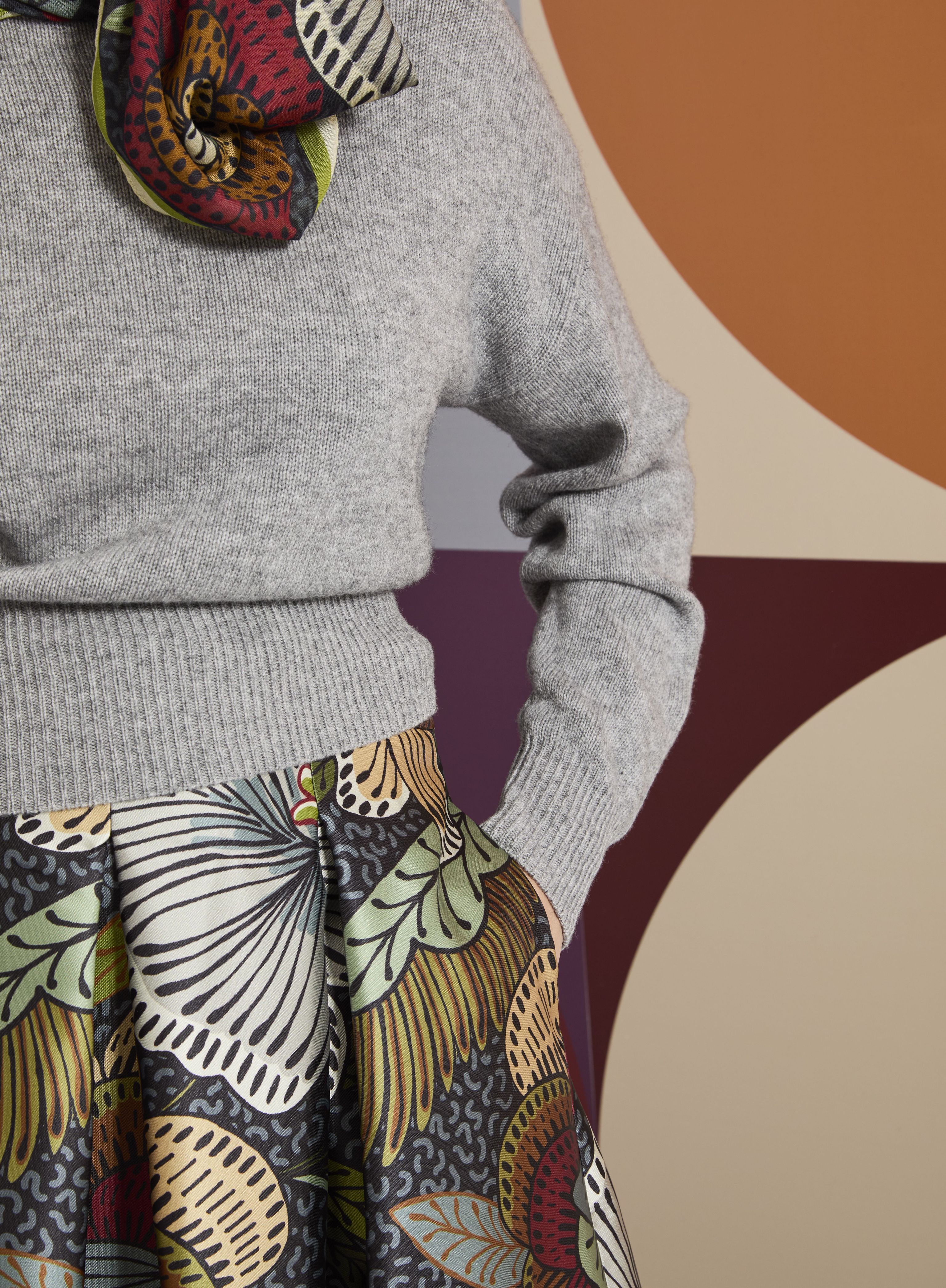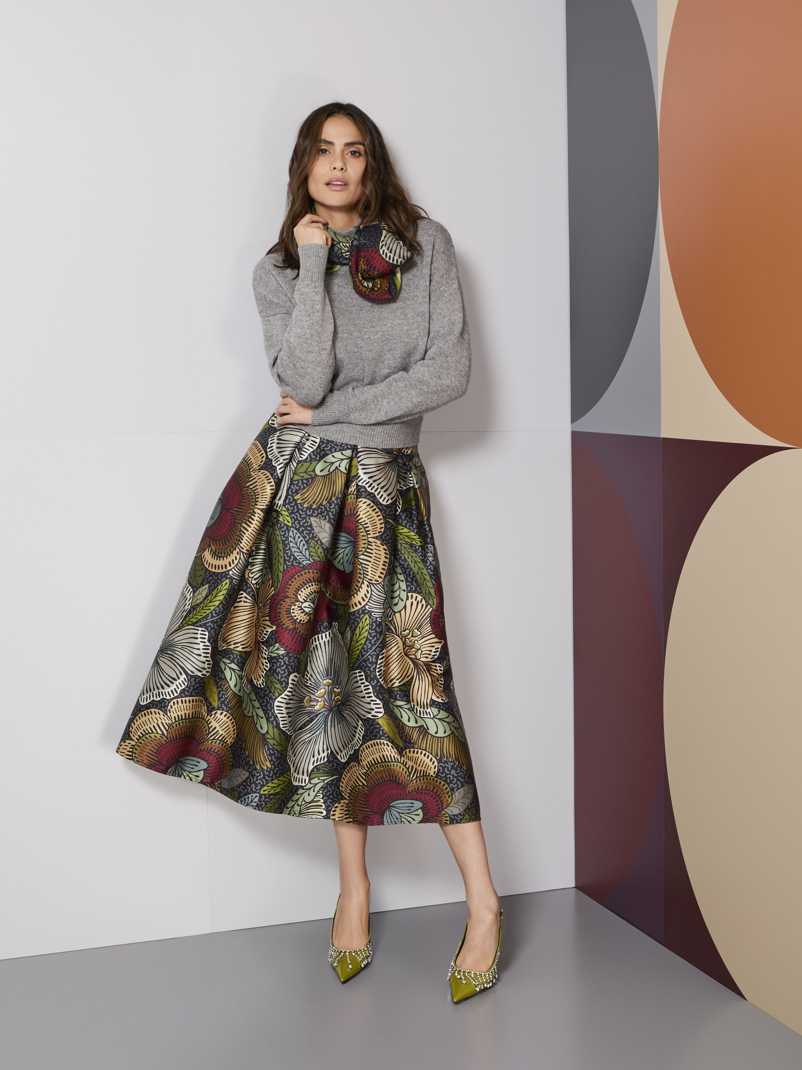 Gemusterte Röcke in Bleu, Verde und Fuchsia setzen farbliche Akzente mit starker Ausdruckskraft. Ihre intensiven Töne bringen Leichtigkeit in die kühle Saison und verleihen jedem Modell eine selbstbewusste, stilvolle Präsenz. Außergewöhnliche Details sorgen für eine Silhouette, die Klarheit und Bewegung auf natürliche Weise vereint.