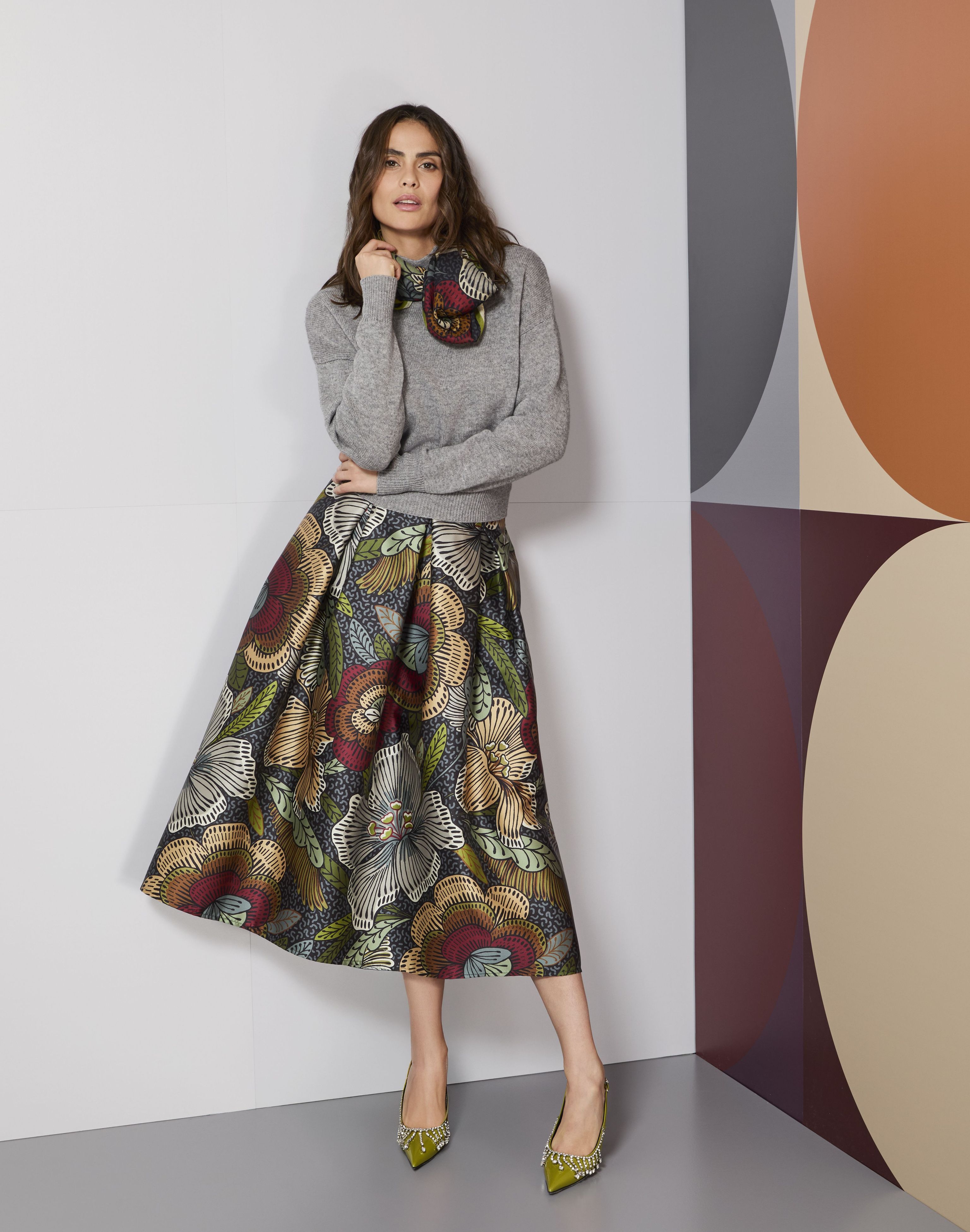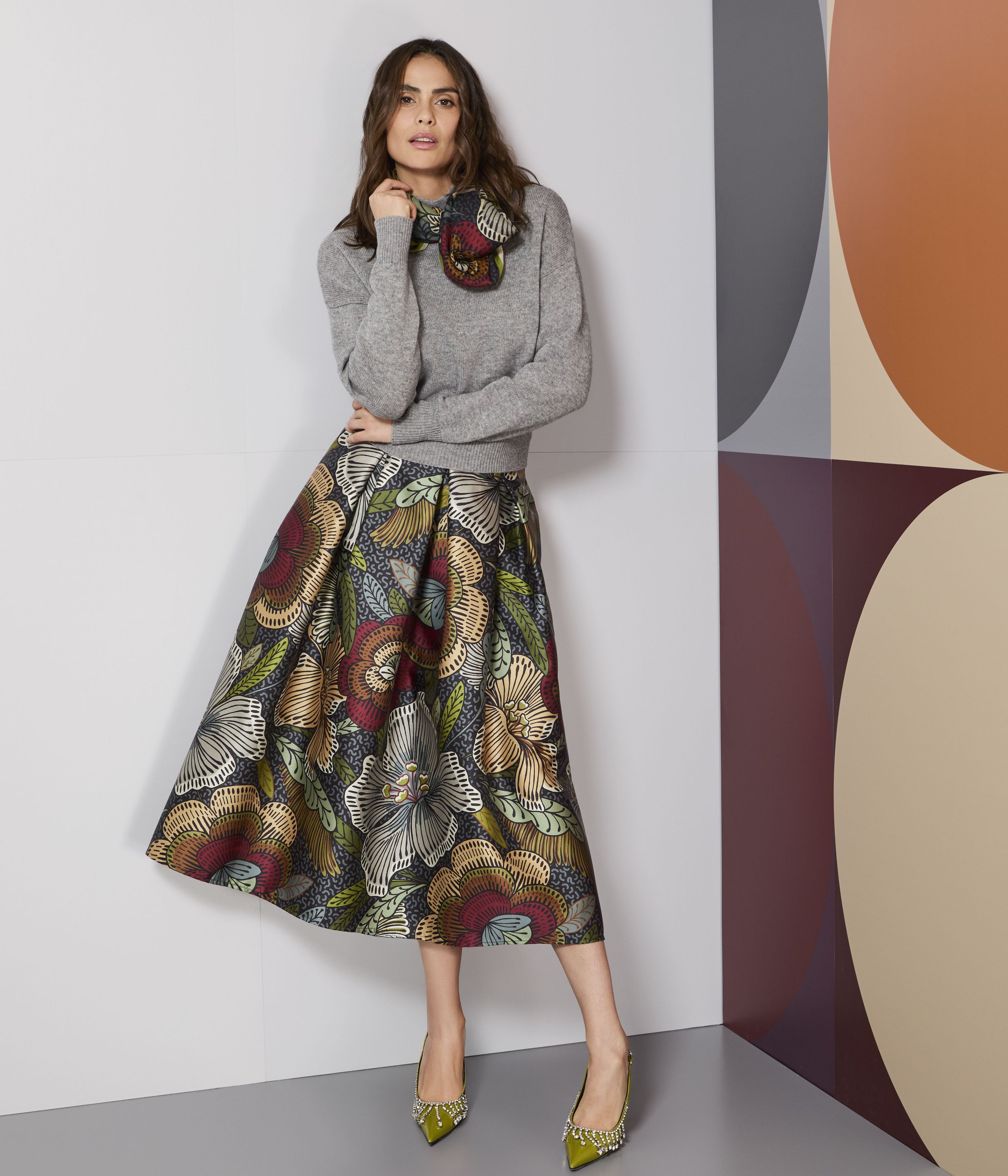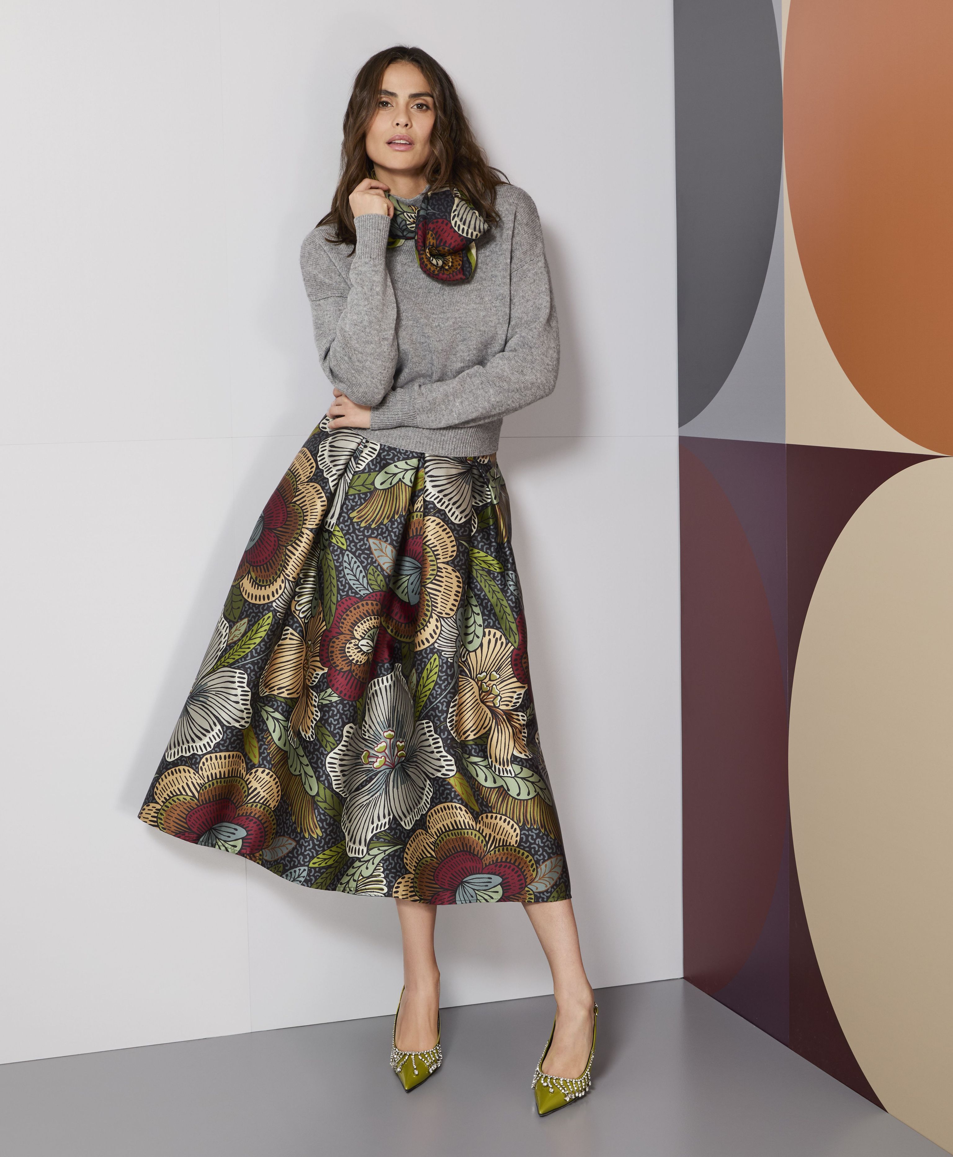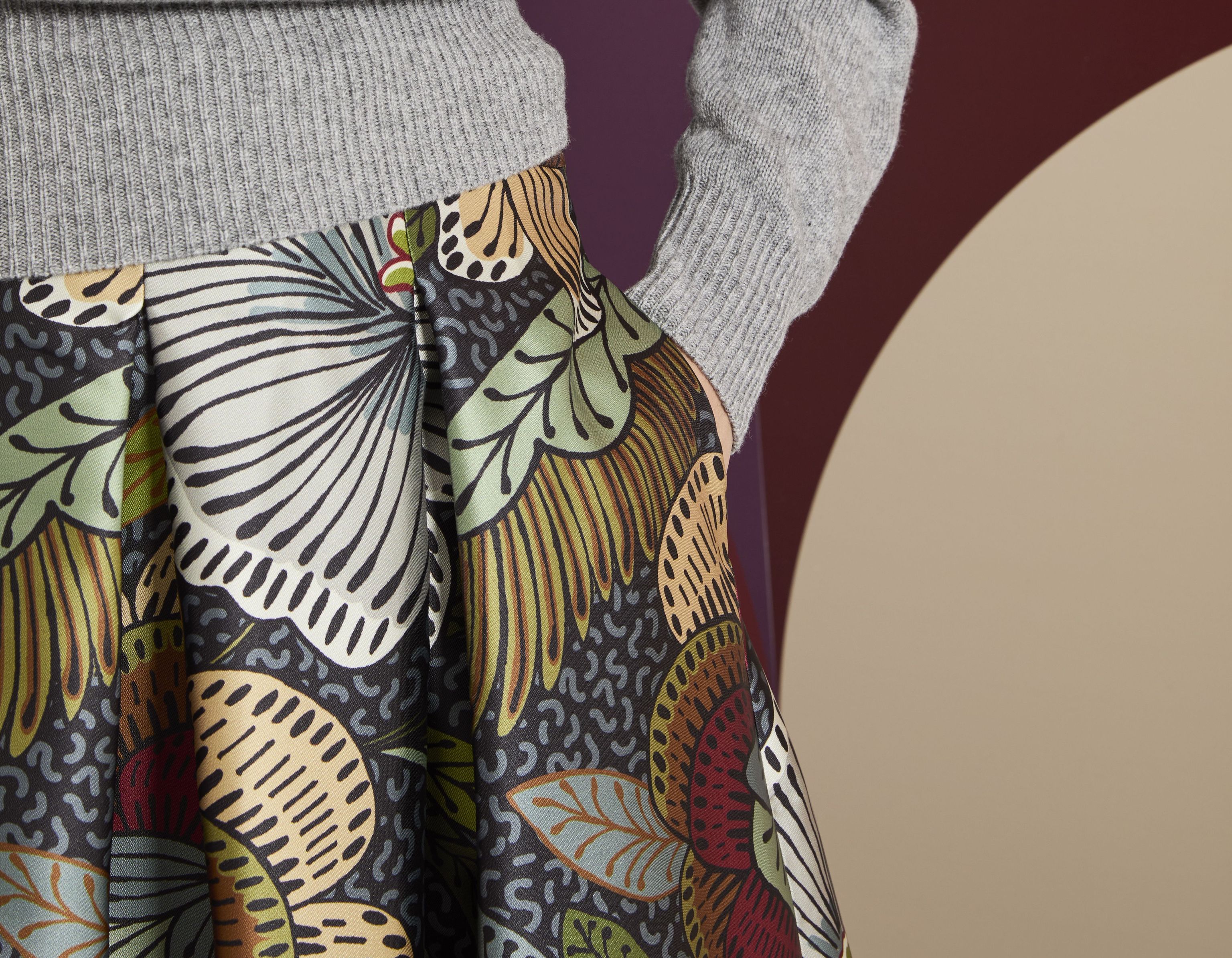Leuchtende Farben wie Fuchsia, Oliv und Bleu, kombiniert mit ausdrucksstarken Mustern, machen diese Röcke zu Highlights der Saison.